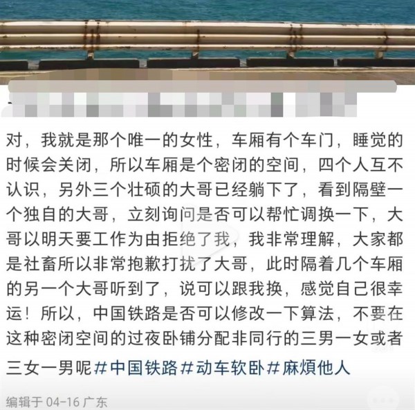 文章称,单就女性安全而言,封闭式的软卧,开放式的硬座和硬卧,都可能会有潜在的安全风险,再先进的购票系统,也无法甄别和筛选那些心怀不轨的人。但让乘客能够选择“同性别包厢”,绝不仅仅是像有些人说的,只是为了满足女性的优越感,而是通过个性化的服务,尽可能地满足不同旅客的个体需求,让他们免于尴尬和不安,从而提升整体的出行体验,这对任何性别、年龄、出行状况的旅客而言,都是有好处的。