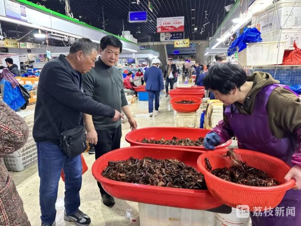 上午8点多,盐城市人民路菜场水产区域热热闹闹,新鲜的小龙虾按照产地、个头大小被摆在显眼位置,经营户们正忙着为顾客称重打包。