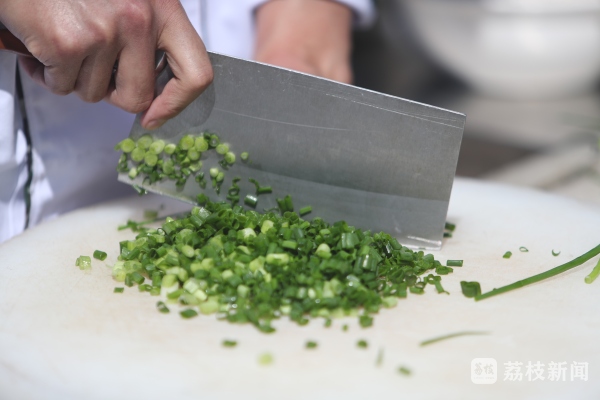 与此同时,洗净菜板,手起刀落,精湛的刀工使得葱花像粘贴复制一般,大小均匀。菜刀在他们手中不停翻飞,哒哒哒发出的响声像战地响起的交响乐。