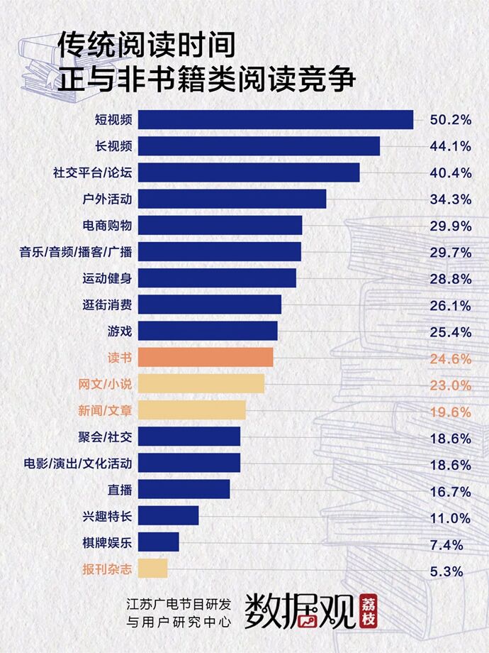 调查显示,刷短视频和长视频,分别以50.2%和44.1%的选择率位居前二,读书则以24.6%位列第十。但若将看网文、新闻或网络长文等非书籍阅读也包含在内,总体受访者中有54.3%会投入泛阅读。