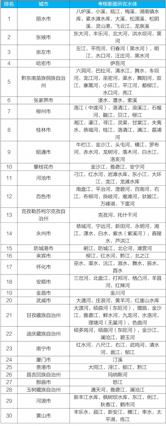 1—3月,全国地级及以上城市中,丽水、张掖和崇左等30个城市国家地表水考核断面水环境质量相对较好(从第1名至第30名),白城、五家渠和开封等30个城市国家地表水考核断面水环境质量相对较差(从倒数第1名至倒数第30名)。