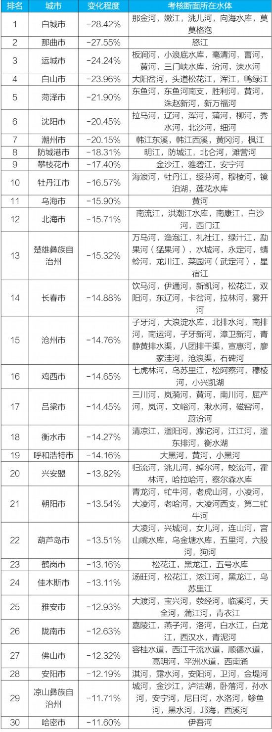 白城、那曲和运城等30个城市国家地表水考核断面水环境质量变化情况相对较好(从第1名至第30名),朔州、咸阳和鄂州等30个城市国家地表水考核断面水环境质量变化情况相对较差(从倒数第1名至倒数第30名)。