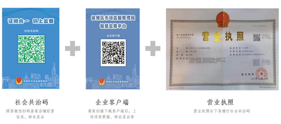 三是优化“放管衔接”。通过“一照准营”核发的《营业执照》应悬挂在经营场所显著位置,与相关许可证法律效力等同。市场监管部门在检查中,通过扫描营业执照上的二维码,核查相关许可证、从业人员健康、日常监管信息,同时消费者也可以通过扫描形式参与到监管中来,实现食品安全“社会共治”。