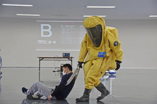 报道称,训练模拟可疑人物散播化学物质后出现多名伤者的情况,训练过程中身穿防护服的消防人员转移受伤人员,安保人员则在呼吁旅客冷静避难。