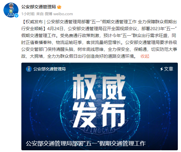 4月24日,公安部交通管理局召开全国视频会议,部署2023年“五一”假期交通管理工作。今年“五一”假期时间较长,旅游探亲需求集中释放,受免费通行政策刺激,预计自驾游、周边游、跨省游明显增多,同时正值春播春种、物流运输旺季,人员流动、货运物流密集,客货流量明显增长,加之局部地区受雨雾恶劣天气影响,各类风险隐患交织叠加,安全畅通压力巨大。