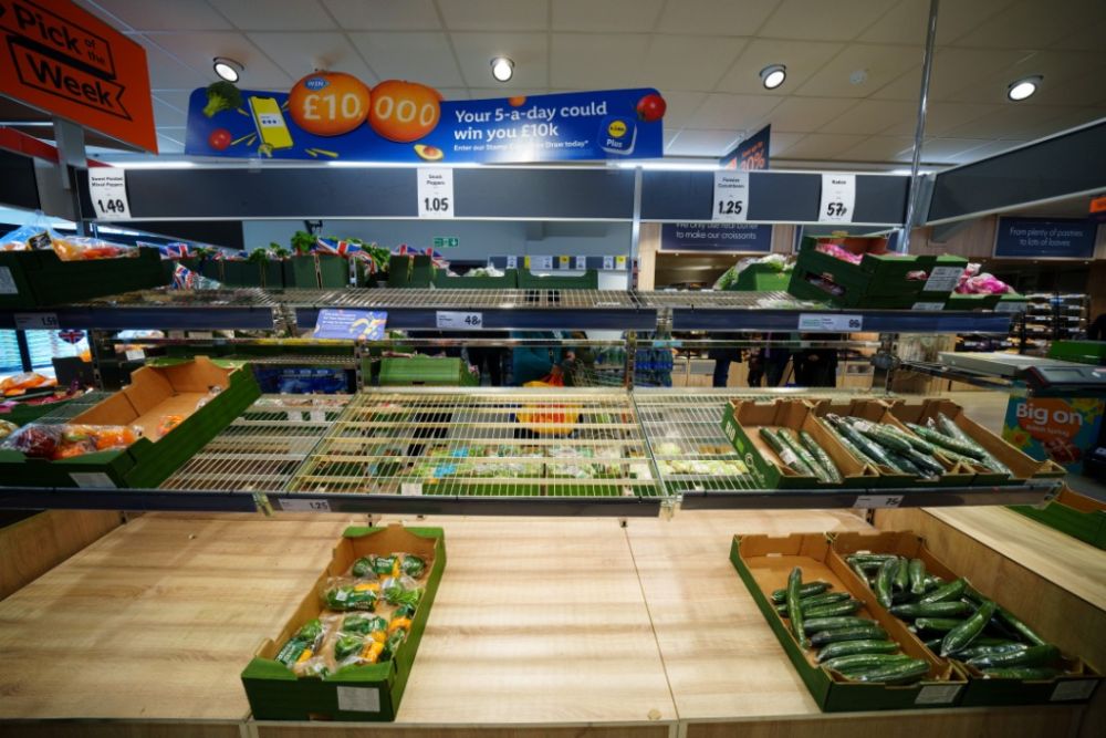 2月23日,在英国曼彻斯特,一家超市的蔬菜货架出现缺货。新华社发(乔恩·休珀摄)