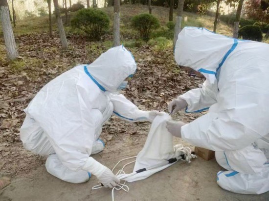 身着防护服的4名工作人员在草地、灌木丛上缓慢拖拉着白布旗前行,每走一段距离,便停下检视附着在布旗上的蜱虫数量,并将蜱虫放到冻存管中分类编号,工作人员连续工作5小时后,衣服已完全被汗水浸湿。