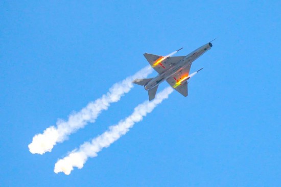 “计时加力起飞!”随着指挥员一声令下,多架战机接续滑出,编队升空。云天之上,战机编队密切协同。在抵达预定空域后,战机快速建立攻击航线。俯冲、瞄准、射击……飞行员使用多型机载武器对目标靶轮番攻击,炮弹拖着长长尾焰划破天空。阵阵轰鸣声中,预定目标靶被精准打击摧毁。
