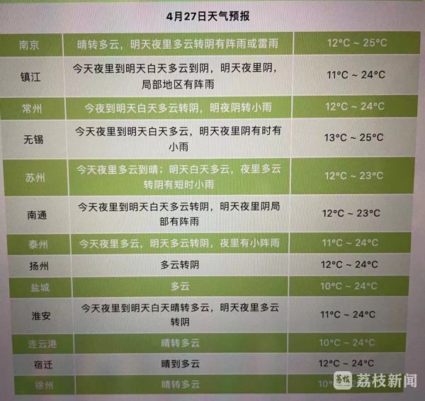 4月27日20时至4月28日20时沿江和苏南地区多云转阴,部分地区有小雨,其他地区多云到阴。最高温度:沿江和苏南地区27℃左右,其他地区25℃左右;最低温度:沿江和苏南地区15℃左右,其他地区13℃左右。全省偏南风转偏西风,风力都是3-4级。