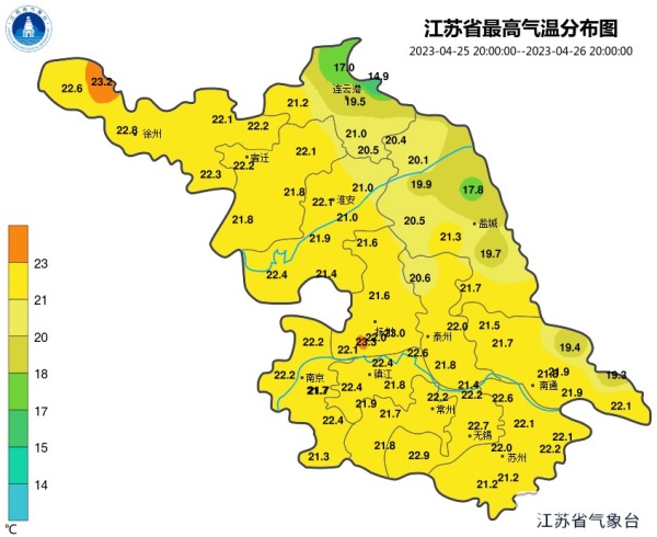 据江苏省气象台最新发布的消息:今天(4月26日)全省转晴,阳光和煦,气温迅速攀升,全省大部日最高气温都在22℃左右,东部沿海地区稍低(18℃左右)。预计明天西南部地区最高升至25℃左右,昼夜温差较大。气象部门提醒大家:注意增减衣物。
