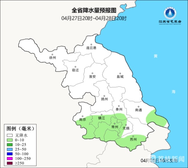 28日沿江和苏南有弱降水过程,雨量较小,气温继续呈上升趋势。28日最高气温可达27℃。