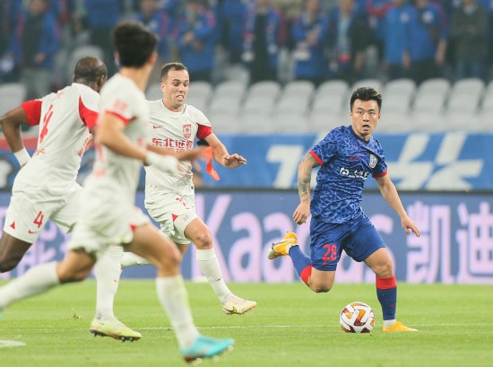 4月26日,上海申花队球员曹赟定(右一)在比赛中带球进攻。新华社记者丁汀摄
