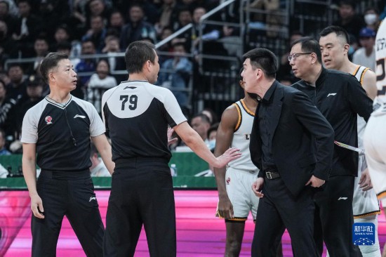 4月26日,辽宁本钢队主教练杨鸣(右三)在比赛中对判罚提出质疑。新华社记者 潘昱龙 摄