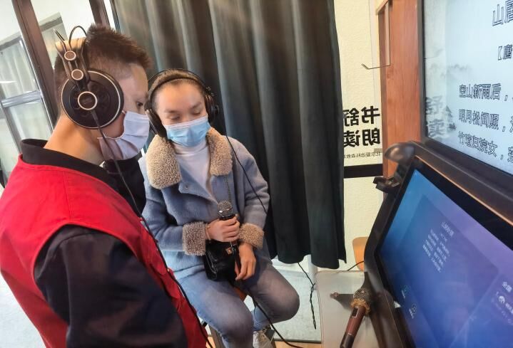 2022年10月14日,在山东省光明之家盲人数字图书馆,盲人读者体验“朗读亭”。新华社记者袁敏 摄