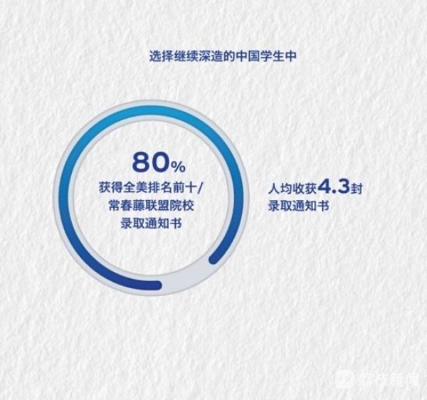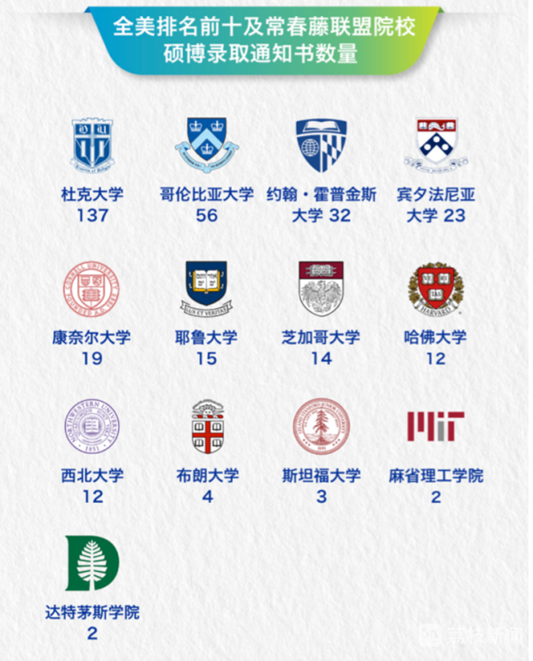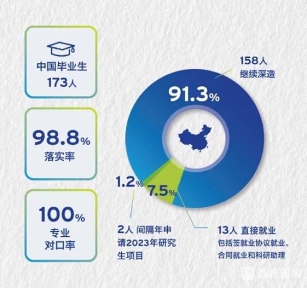 173位中国毕业生中,158人选择继续深造,超过80%获得全美排名前十或常春藤联盟院校录取通知书。申请研究生项目的中国学生人均收获4.3封录取通知书,其中18名学生斩获49封直博录取通知书;就业方面,有就业意向的13名中国毕业生全部就业,最高年薪约为13.8万美元(海外就业,年薪为美元计算,约合95万人民币),年薪中位数为26.3万人民币,就业机构包括麦肯锡咨询、谷歌、普华永道和腾讯等。