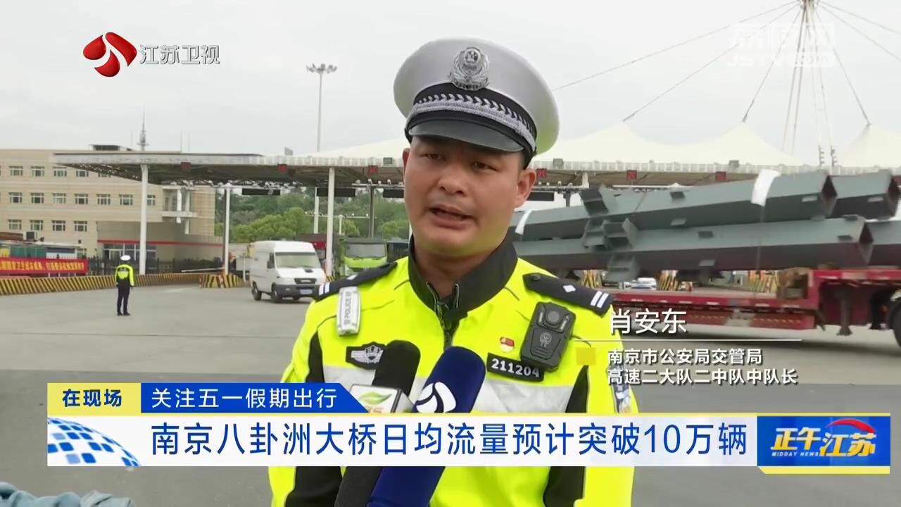 江苏台记者许莹:“明天就是五一小长假的第一天了,我们现在是在南京八卦洲大桥的收费站,可以看到身后双向的车辆通行还是比较顺畅的。今年五一小长假期间,全省的高速公路流量预计比2019年的同期增长了17%,群众跨省市出行的需求比较旺盛。为了确保高速公路的通行安全,降低事故风险,南京交警也做出了专项的安全提示。”