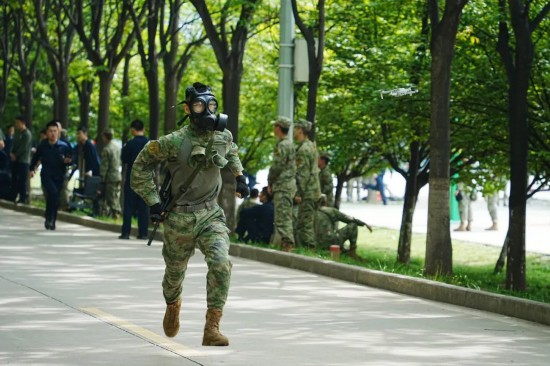 队员们迅速戴好防毒面具
