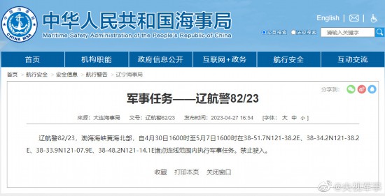 据中国海事局网站消息,大连海事局发布航行警告,自4月30日16时至5月7日16时,渤海海峡黄海北部执行军事任务,禁止驶入。