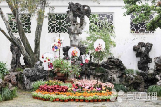厅堂精品展示区主要位于五峰书屋、看松读画轩、轿厅等区域,布设精品盆栽、中式插花、拼盆小景等形式的牡丹、芍药作品。精品盆栽陈列牡丹50余盆,包含红花露霜、景玉、紫二乔等5大色系约10个不同品种;芍药20余盆,包含种生粉、公爵夫人、红富士等5个品种。中式插花采用种生粉、夏威夷珊瑚等品种的芍药鲜切花为主要花材,用插花的方式营造出园林写意山水的文化韵味。拼盆小景利用假山、鲜花、小型绿叶植物、苔藓等,形成模拟自然的园艺小品,以多样的形式展现古典园林中的花卉文化形象。