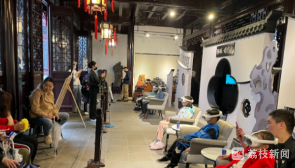 来到狮子林“狮林园宇宙”体验馆寻座坐下,戴上VR眼镜,眼前的景象不断下移,仿佛化身一只飞鸟离开地面、翱翔天空,真正俯瞰狮子林,而随着视角不断切换,游客“飞”过园林的每一处宅院、厅堂,游览古典园林全貌。
