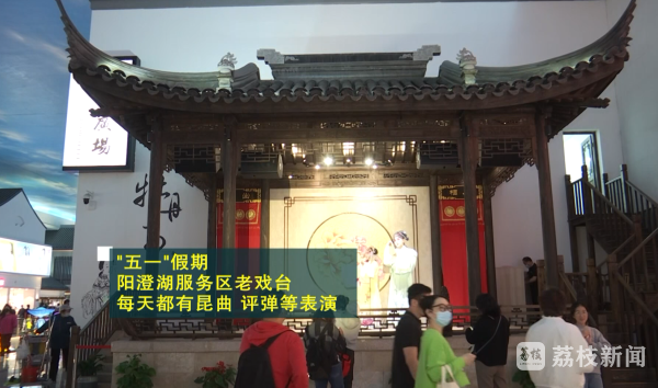 说到苏州,能联想到小桥流水、粉墙黛瓦,在阳澄湖服务区里穿行,能欣赏到最具苏州特色的园林景观,今天恰逢细雨,更有点苏州水乡的韵味了。五一假期,每天都有昆曲、评弹表演。