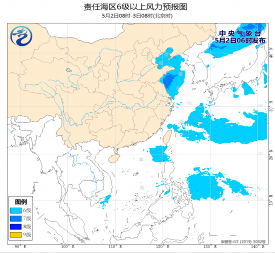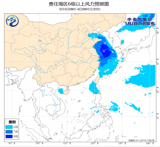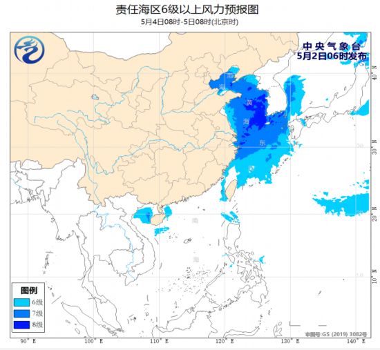 预计,5月3日白天至4日夜间,渤海、渤海海峡、黄海大部海域、东海北部海域将有7~8级、阵风9~10级的大风。为此,中央气象台2日06时发布《海上大风预报》。