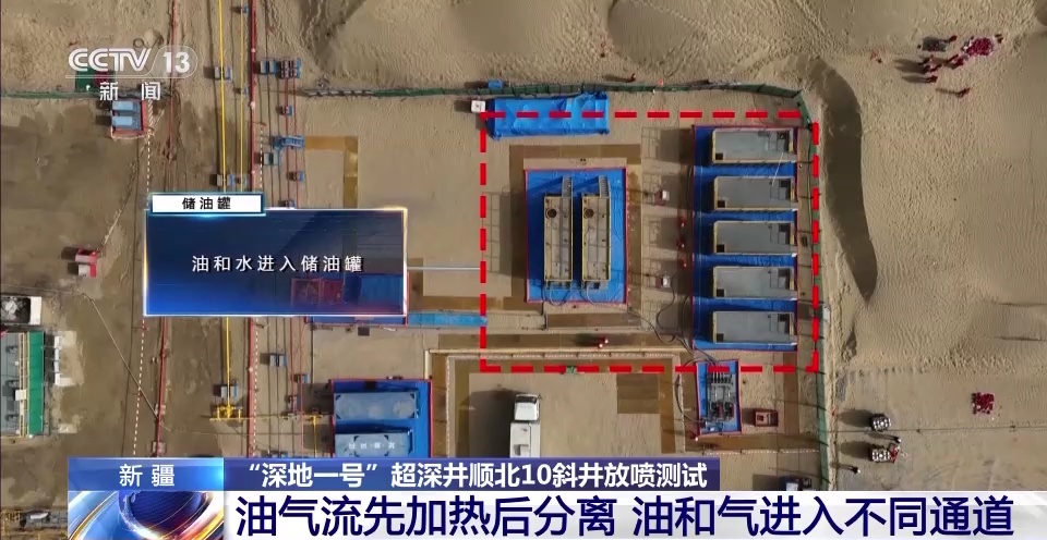 在下达开井指令之后,如果有油气流,这些油气流首先会进入到这个蓝色的大罐子里加热。我们知道,地下8000多米的油气流压力非常高,温度也很高,能达到170摄氏度。所以需要给它节流降压,在这个过程中,油气流的温度会度骤降到零下20摄氏度左右。通过这个大罐子给它加热到15摄氏度左右,再进入到下一个蓝色罐子,也就是分离器分离成油、气、水。油和水会进入到这些灰色的储油罐中,气就通过黄色的管道通向放喷口。