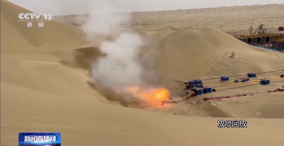 在距离“深地一号”跃进3-3井260多公里之外,位于塔克拉玛干沙漠腹地,有另外一口“深地一号”的超深井——顺北10斜井已经钻探完毕,井深8591米,今天正式放喷点火,来测试这口井是否有油气流。