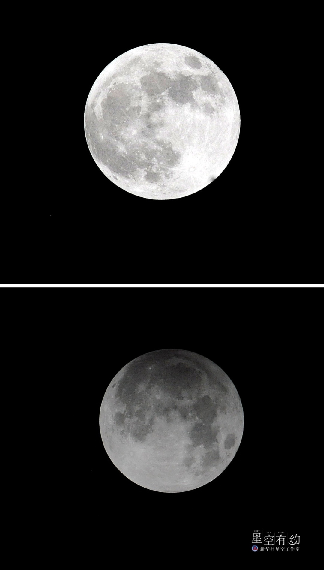 这是2012年11月28日晚在北京拍摄的月亮。上图:20时13分半影月食开始时的月亮;下图:22时02分的月亮,虽然月光暗了,但月球表面层次却增加了。新华社记者何俊昌 摄