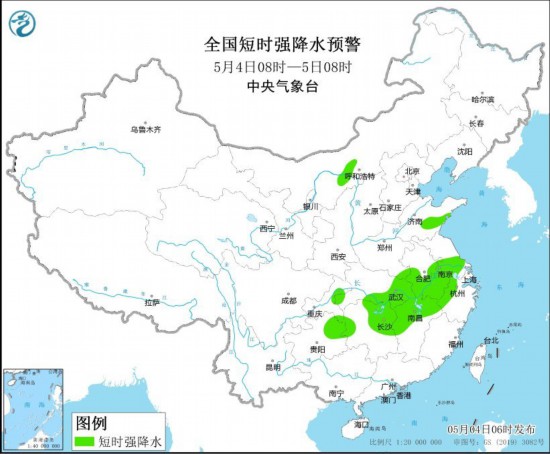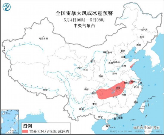 预计5月4日08时至5日08时,山东东部、安徽中南部、江苏南部、湖北东部和南部、湖南中北部、江西北部、重庆东南部、贵州东北部等地的部分地区将有8-10级雷暴大风或冰雹天气;内蒙古西南部、山东中南部、河南南部、安徽中南部、江苏中南部、湖北东部和南部、湖南中北部、江西中北部、浙江中北部、重庆东北部、贵州东北部等地的部分地区将有短时强降水天气,小时雨量20-40毫米,局地可达50毫米以上。