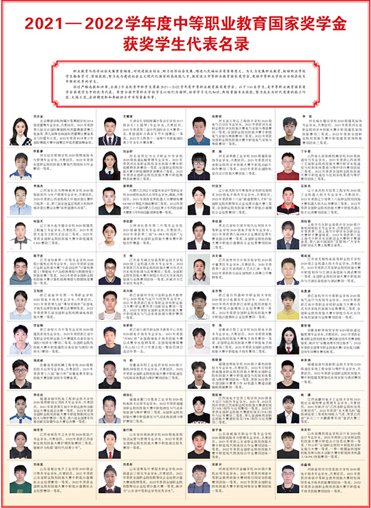 经过严格选拔和评审,全国2万名优秀中职学生荣获2021—2022学年度中等职业教育国家奖学金。以下100名学生,是中等职业教育国家奖学金获奖学生中的优秀代表。希望全国中等职业学校学生以他们为榜样,刻苦学习文化知识,熟练掌握专业技能,努力成长为时代需要的能工巧匠、大国工匠,在拼搏进取和奉献担当中书写青春华章。