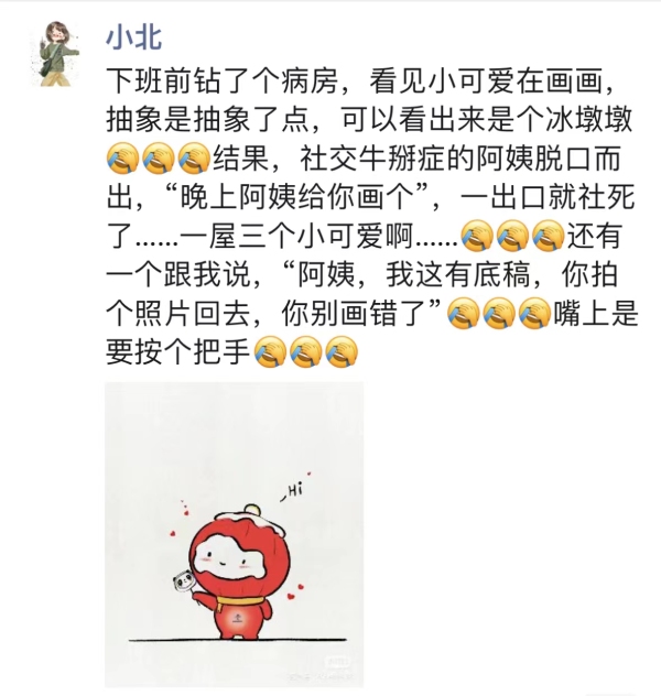 手术后多多少少都有点不适,为了赢得孩子术前的配合、尽量减少孩子术后的不适,赵晶晶看到孩子在画画,也会许诺送孩子自己画的画,时常和小患者们交流切磋画技,此时,她仿佛变身美术老师,现场一派医患和谐其乐融融的氛围。