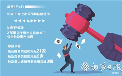 据上市公司公告梳理统计,截至5月4日,年内30家上市公司将陆续退市,其中5家已摘牌,另有25家处于退市流程中或已公告触及退市指标。综合来看,触及财务类退市指标21家,触及交易类退市指标6家,触及重大违法强制退市指标3家。