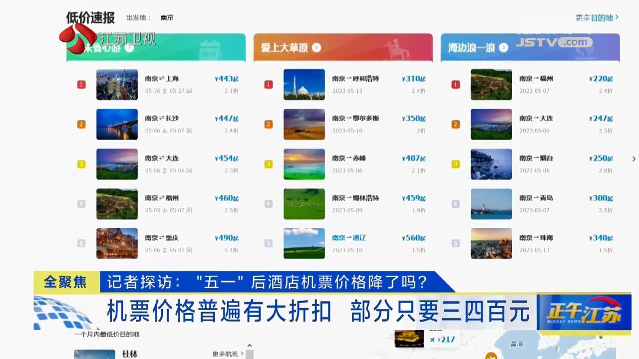 “五一”假期前,酒店、机票价格有所上涨,现在假期结束了,情况怎么样呢?记者走访市场发现,南京酒店价格目前已经恢复到日常水平,机票价格也是明显回落,如果有条件,眼下正是错峰出游好时机!