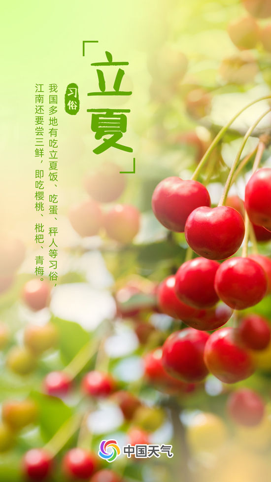 立夏还是品尝美食的好时节,许多家庭会将赤豆、黄豆、黑豆、豌豆、绿豆做成“立夏饭”,寓意“五谷丰登”。江南有“尝三鲜”的习俗,即品尝甜蜜樱桃、爽口青梅以及清甜枇杷。