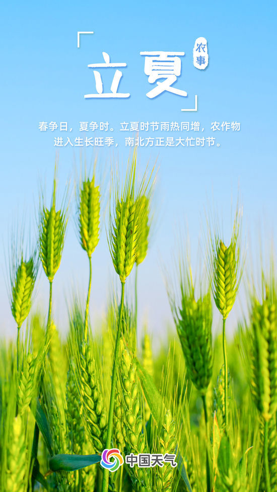 如果说春是生的季节,那么夏就是长的季节。《历书》曰:“斗指东南,维为立夏,万物至此皆长大,故名立夏也。”立夏,是标示万物进入旺季生长的一个重要节气。此时,日照增加、气温渐升、雷雨增多,农作物进入了茁壮成长阶段。春播作物渐渐长大,夏收作物进入生长后期,冬小麦扬花灌浆,油菜接近成熟,大江南北都进入了农事繁忙时期。