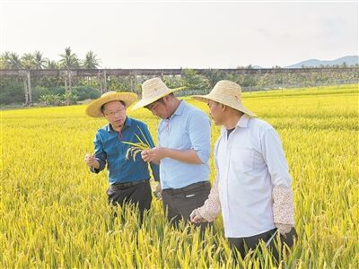 江苏里下河地区农业科学研究所水稻育种团队在国家南繁科研育种基地示范田查看水稻生长情况。柳鑫摄