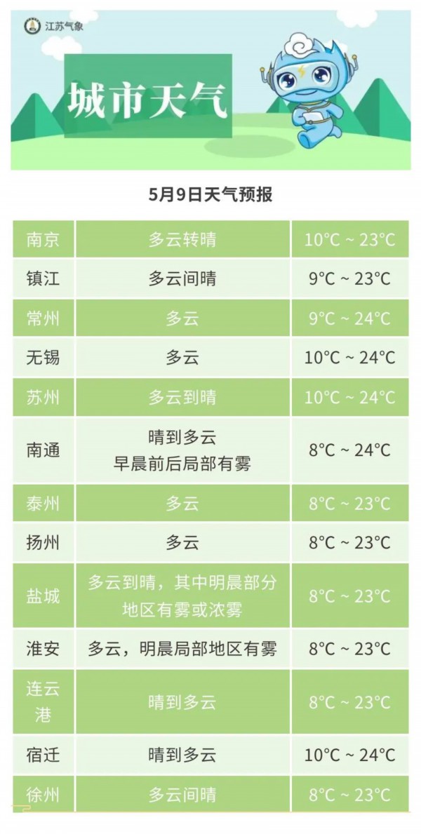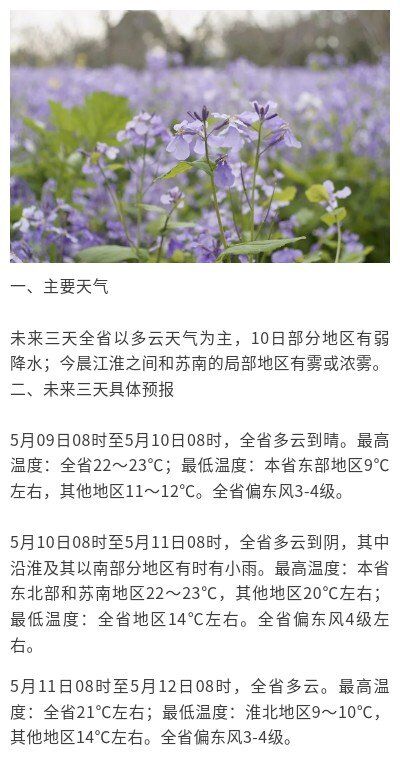 本省西南部地区多云转阴有时有小雨,其他地区多云。最高温度:沿江和苏南地区22~23℃,其他地区20℃左右;最低温度:江淮之间东部地区9℃左右,其他地区12~13℃。