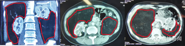 “患者之所以吃不下饭,是因为瘤体巨大压迫腹腔胃肠道,导致食欲不振,除了胃肠道,由于瘤体还压迫到了腰部肌肉及神经,患者来的时候腰部疼痛明显,难以直立行走,整个人非常消瘦,营养状况堪忧!”该院泌尿外科主任、主任医师徐彦教授为王女士做了详细检查,明确诊断为“双侧肾脏巨大错构瘤”。他指着王女士的腹部CT影像继续介绍,“患者的整个腹腔几乎被异常巨大的瘤体占满,肾脏被压迫得就像一个被包裹起来的‘枣核’,肝脏、脾脏也被瘤体挤压错位变形,双侧瘤体甚至延伸到盆腔。”徐彦主任表示,像这样巨大的双肾多发性巨大错构瘤十分罕见,由于压迫到多个脏器,造成相关系统器官功能受损,且出血风险极大,必须尽快手术切除,否则一旦发生破裂,患者有生命危险。