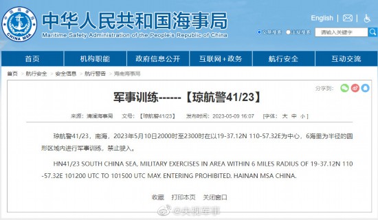 据中国海事局网站消息,清澜海事局发布航行警告,5月10日20时至23时,南海部分海域进行军事训练,禁止驶入。