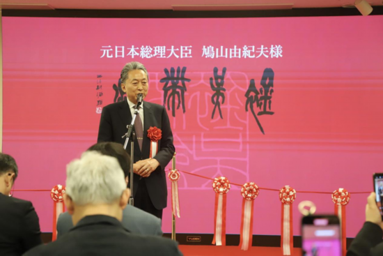 日本前首相鸠山由纪夫在展会上发表致辞。郭丹 摄