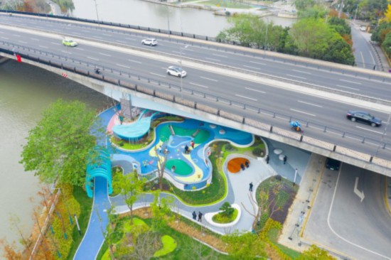 昆山萧林路高架桥下空间的小山坡、摇摇椅等场景颇具童趣,俨然组成了一个桥下的“宝藏游乐园”,让人对城市的角角落落充满惊喜。