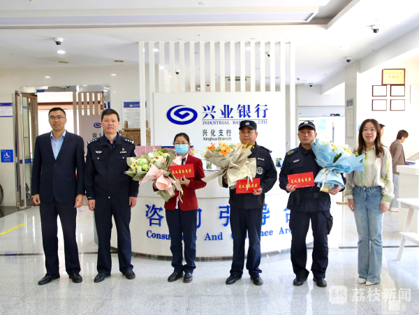 5月9日上午,兴化市公安局、兴化市见义勇为基金会来到兴业银行兴化支行,向3位协助警方抓获涉诈嫌疑人的银行员工送上鲜花及奖金。
