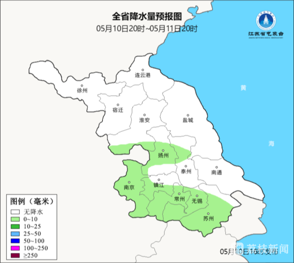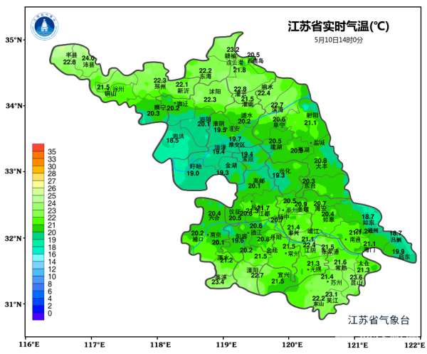 5月10日20时至5月11日20时全省多云到阴,其中淮河以南部分地区有时有小雨。最高温度:沿江和苏南地区20~21℃,其他地区23℃左右;最低温度:苏南地区15~16℃,其他地区13℃左右。