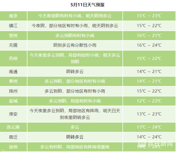 5月11日20时至5月12日20时沿江和苏南地区阴转多云,其他地区多云。最高温度:本省西北部地区26~27℃,其他地区25℃左右;最低温度:淮北地区11~12℃,本省东南部地区15℃左右,其他地区13~14℃。