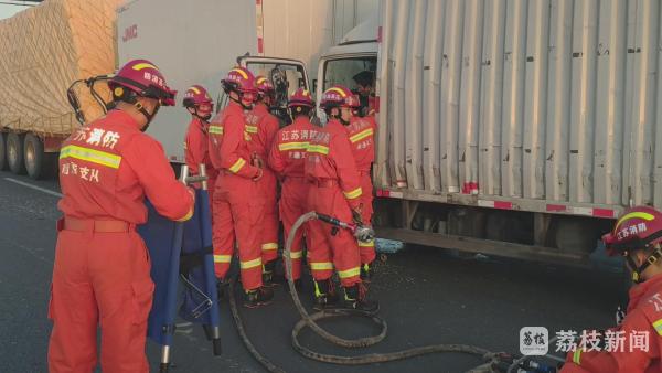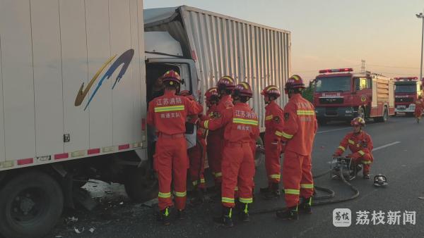 昨天(5月9日)傍晚6点多钟,南通市沿江公路与江港路附近发生一起追尾车祸,一辆厢式货车追尾了前方等待红绿灯的两辆货车,中间与后车司机均被困于驾驶室内无法动弹。江苏省南通市消防救援支队开发区化工园区专职消防救援站接到报警后,立即出动三车十七名消防救援人员赶赴现场救援。