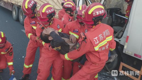 经过消防救援人员短暂的细心营救,第一名被困司机已被安全救出,并被送至医院进行救治。指挥员立即指挥半挂车向前行驶腾出救援空间,继续营救中间车辆驾驶员。