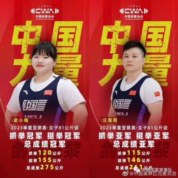 女子81公斤级A组决赛中,梁小梅包揽抓举、挺举和总成绩三枚金牌,汪周雨获得三个项目银牌。