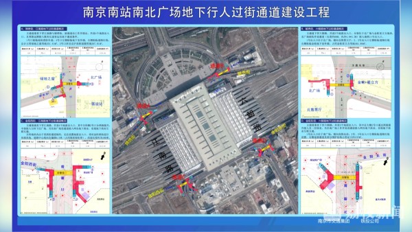 铁路南京南站周边道路车流量大、红绿灯多,过街人流与机动车辆容易产生交织。为此,南站在南北广场四个象限规划建设了ABCD四个地下过街通道,提升行人过街的通达性和便捷性。其中,施工进度最快的是连接北广场的A通道,它位于锦绣街和江南路交叉口,是连接车站西侧商务区的重要节点。主通道全长约215米,共设4个地面出入口。