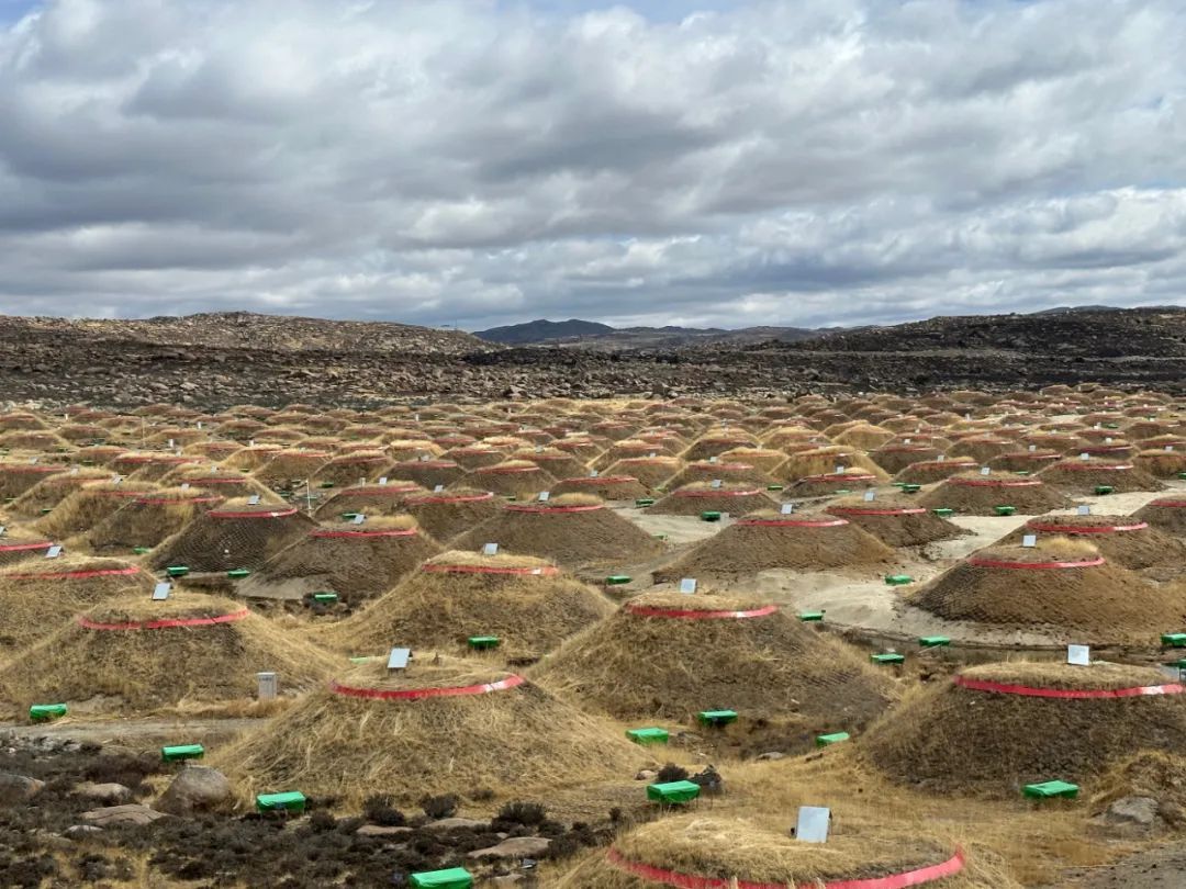 登上“拉索”阵列观景平台,许多规则排列的土堆映入记者眼帘。这些土堆大约两人多高,每个占地约36平方米,土堆之间间隔30米。
